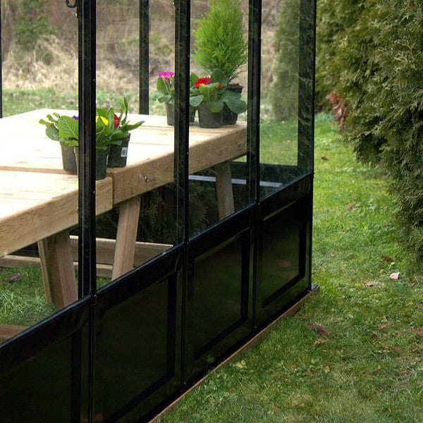 The Parkside greenhouse blends strength, durability, and elegance with its aluminum frame, tempered glass covering, steep pitch roof, and decorative ridge cresting. Measuring 8' 7 1/2" wide, 10' 8" long, and 9' 8 1/8" tall, this hobby greenhouse features a sturdy aluminum structure and a 32" x 76" storm door with a locking latch, adjustable glass, and a screen for ventilation. Its 45° pitch roof, elegant ridge cresting, and stylish base panels add a classic English charm to any backyard. The decorative base panels not only enhance the look but also conceal soil bags and pots while protecting the lower greenhouse from lawnmowers and trimming mishaps. They also remove the need for a concrete foundation, requiring just a row of 4x4s for installation.