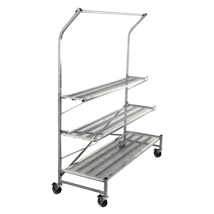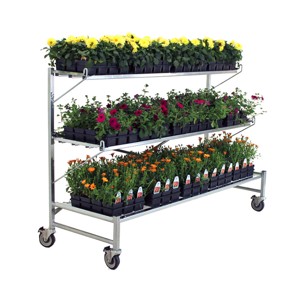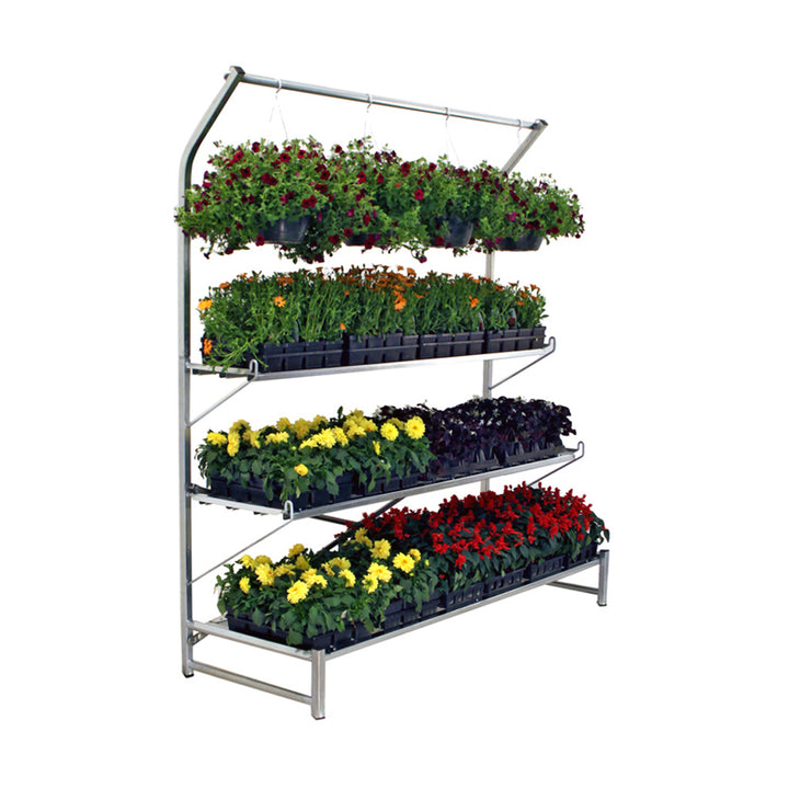 The Flat Mate Display is a three-level display with a narrow, 26" profile, making it ideal for tight spaces or sidewalks. Each 6-foot section of the Flat Mate Display can hold 15 1020-style flats, while the optional purlin is great for hanging baskets. The base dimensions are 73 1/4" W x 26 1/2" D x 44 1/2" H.