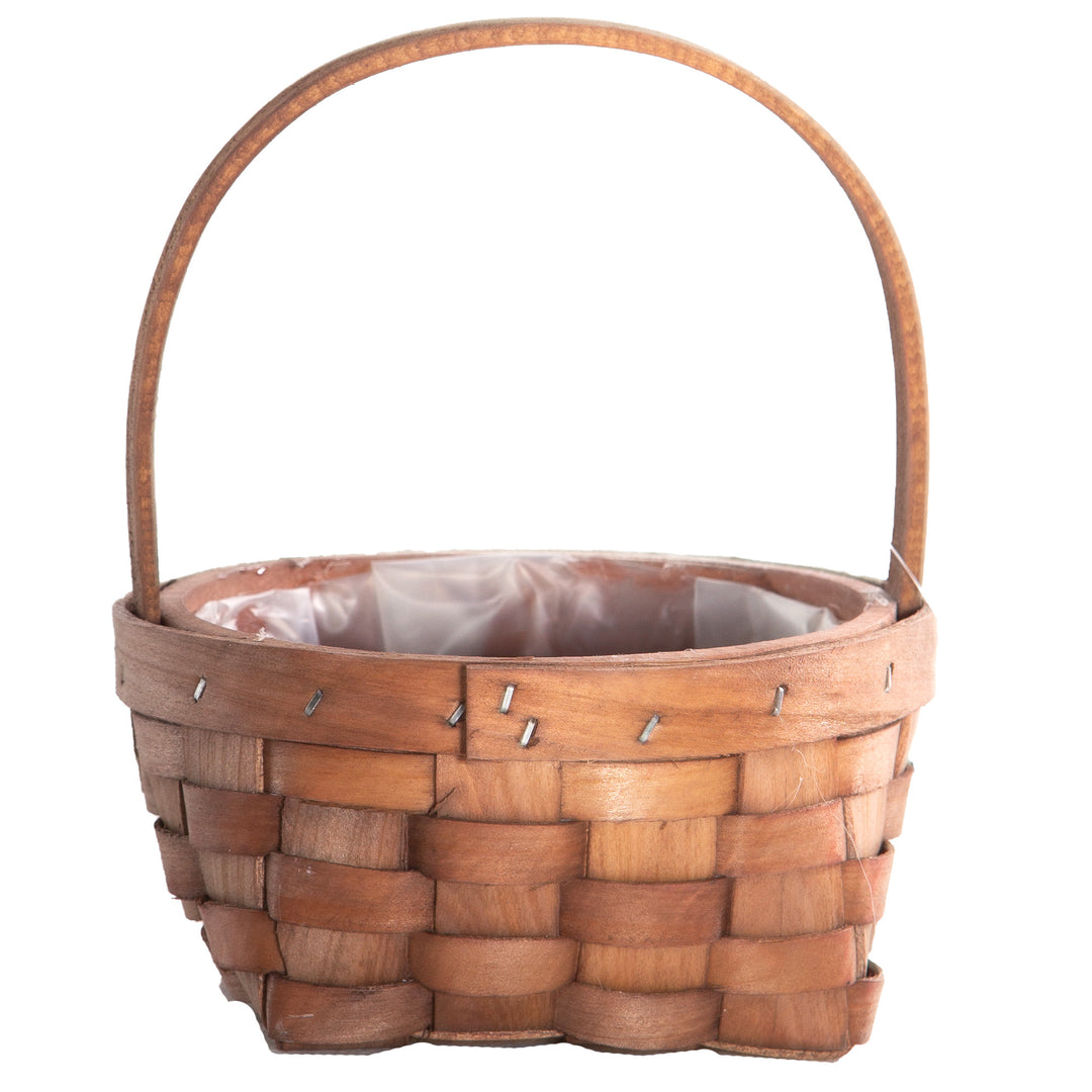 The Gardener Select® Woven Wood Flower Basket will add rustic charm to your home decor. Crafted with light brown wood woven around a sturdy wire frame, this small basket planter comes with a sewn-in plastic liner for indoor use.