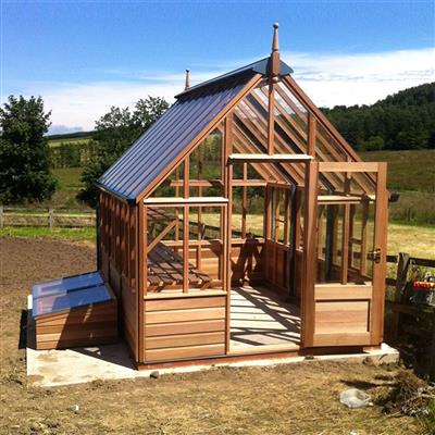 The Gabriel Ash Rosemoor greenhouse measures 6.3' W x 10.25' L x 8.7' H and includes two 2.6' W x 5.1' L x 1.8' H cold frames, which can be attached to the side of your choice. These cold frames are also constructed with Western Red Cedar and glazed with toughened safety glass and they work as a great way to harden off plants as they transition from the greenhouse to the garden.