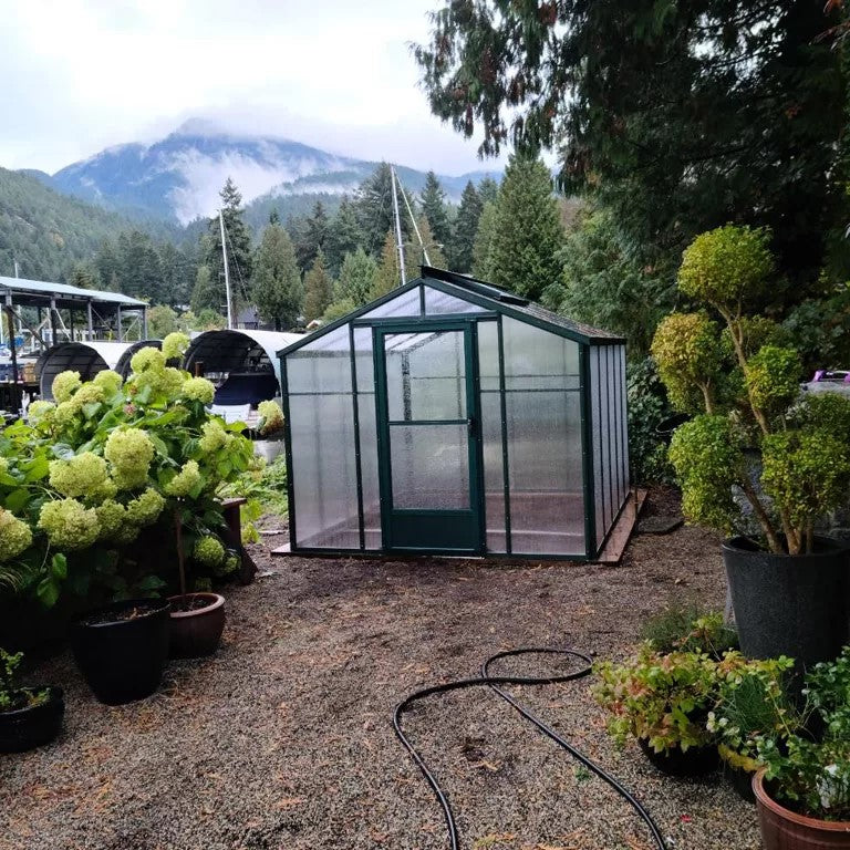 Along with a heavy duty aluminum frame, the Sunhaven hobby greenhouse has 6mm twinwall polycarbonate, designed to stand strong and protect your plants even in heavy snow or high wind. This durable structure will retain heat during the cold months and diffuse harmful UV rays on the brightest of days. The solar-powered automated roof vents save on energy cost while providing increased aeration throughout the greenhouse.