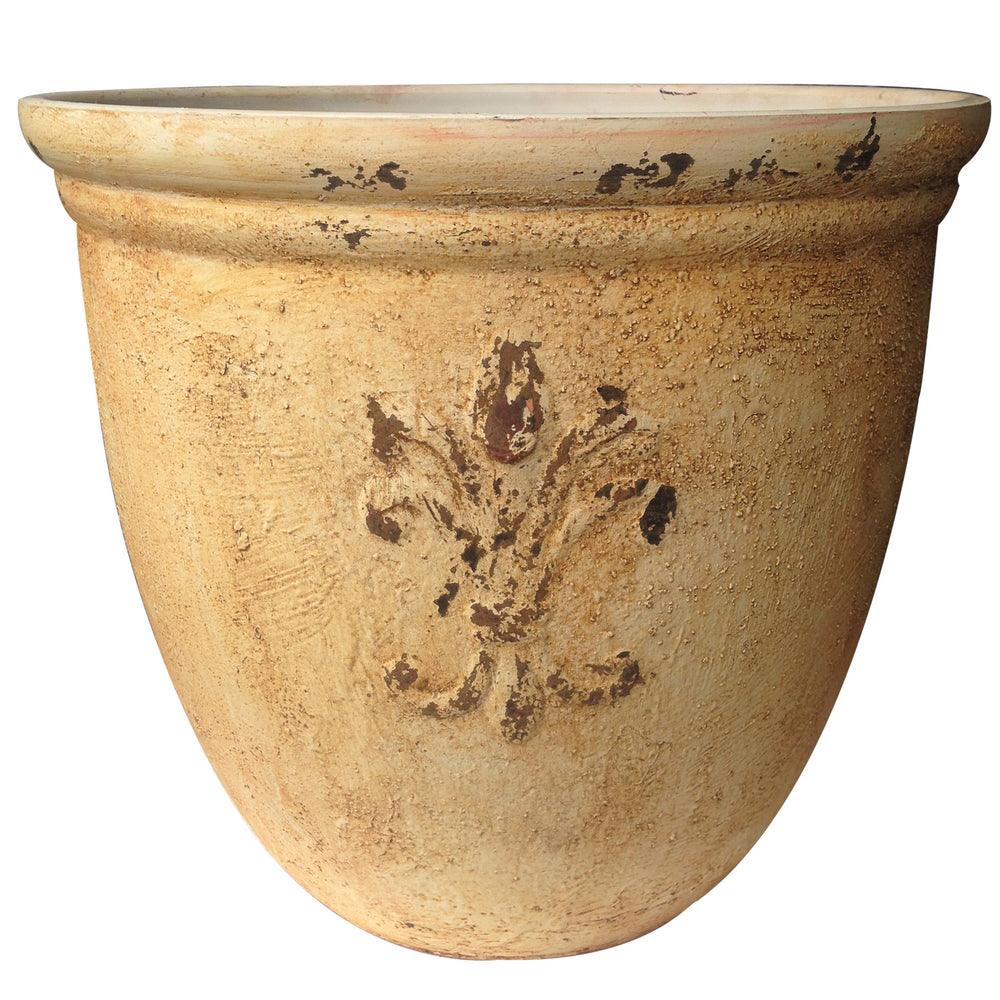 The Gardener Select® Rofia Planter has a touch of French charm with its gently faded look and fleur-de-lis design. These 15-inch diameter plastic planters that combine the visual appeal of ceramic pots with the added benefit of lightweight durability. Enjoy the look of pottery, but without the weight of one.