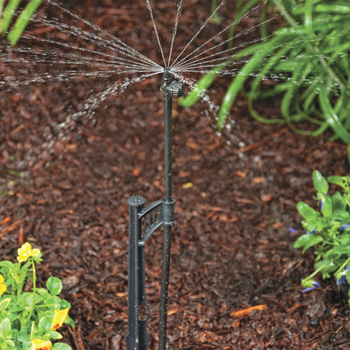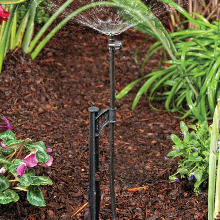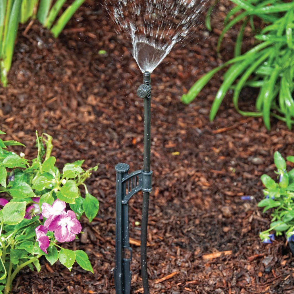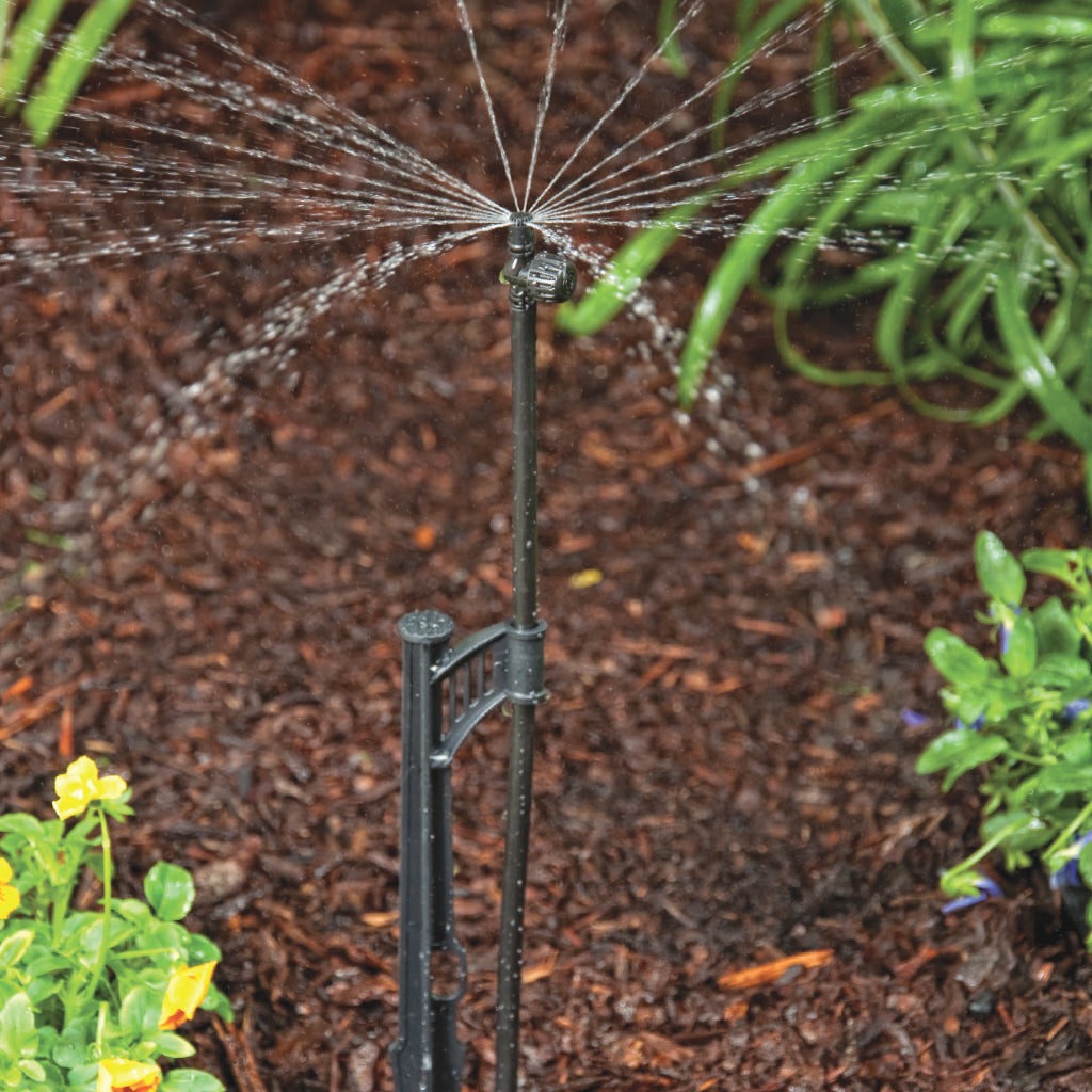 The Adjustable Micro Sprayers are available with full-, half- and quarter-circle patterns with an adjustable flow knob that allows flow control from 0 to 26.1 GPH at 25 PSI. The flow control's main feature is used to change the size of the wetting area with coverage that can reach up to a 10' radius and 21' full circle, depending on the assembly used and the height of the micro sprayers above ground. Using a PE riser extension, the height of the sprayer can be adjusted to fit taller plants and higher vegetation growth. The higher the position of the micro sprayers above the ground, the larger the wetted area will be. These micro sprayers are available with 10/32 thread or in a complete assembly with a 13" stake, 12" PE riser and 1/4" barb for added flexibility in the installation. Use the micro sprayers when overhead watering is suggested on any type of planting, including vegetation that requires moisture, groundcovers, flowerbeds or individual trees along the poly tubing. The recommended spacing is 8' to 12' between the adjustable spray heads or one per tree to a maximum distance of 78' to 108' in length when the flow knob is completely open, using 1/2" drip tubing as the main lateral.