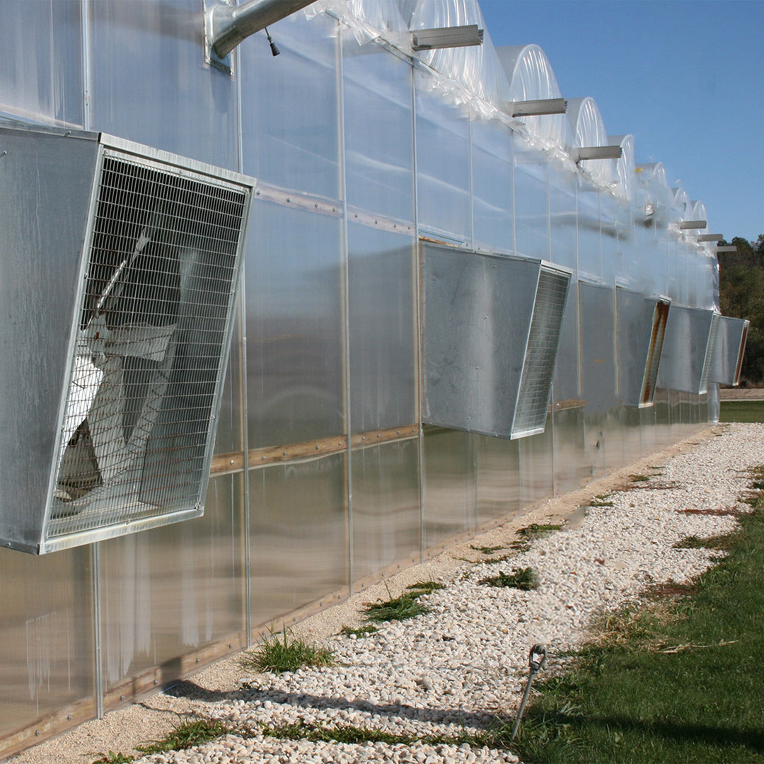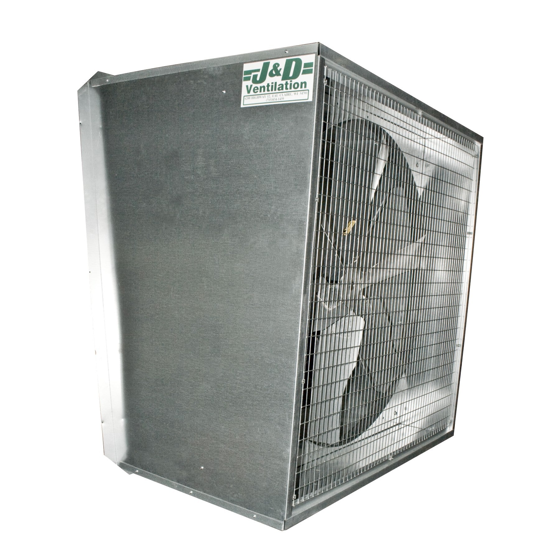 This J&D Typhoon Exhaust Fan is a dependable, yet economical ventilation solution for greenhouses, livestock buildings and other industrial and commercial settings. Slant wall housing is constructed from heavy duty 18 gauge galvanized steel for superior durability and longevity while the galvanized blades are engineered for high output and low noise. Tough, energy efficient totally enclosed motor features automatic thermal protection, pre-lubricated ball bearings and dual-voltage capabilities. Each fan assembly includes slant wall housing, aluminum shutters, hot dip galvanized (after welding) guard and motor. The motor has a 2 year warranty, everything else has a one year warranty for parts and workmanship.