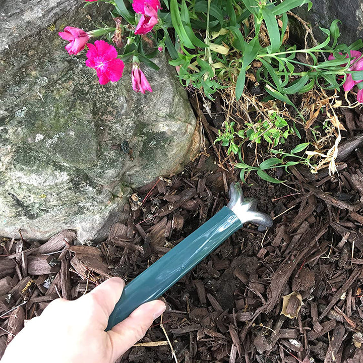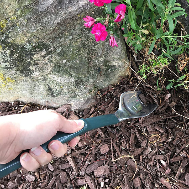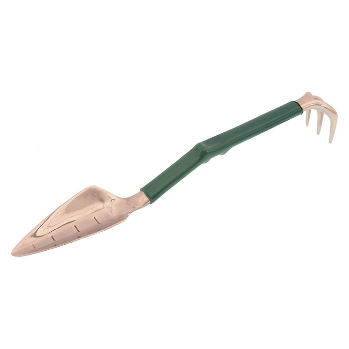What is a Trake? It's the easiest way to care for flower beds, potted plants and more. The Trake combination trowel and rake features two useful tools in one and a lengthy 17-inch handle so it can be used kneeling or sitting, eliminating extra bending. Each head is made of a die-cast aluminum alloy that fully resists rust and retains its shape. The angle of the bidirectional handle provides leverage for digging or cultivating and the rake end is narrow enough to cultivate between crowded plants. Permanent graduations on the trowel blade allow precision for bulb and seed planting while the Terradynamic trowel design penetrates soil easily. Other features include a thumb rest and non-slip vinyl coating.