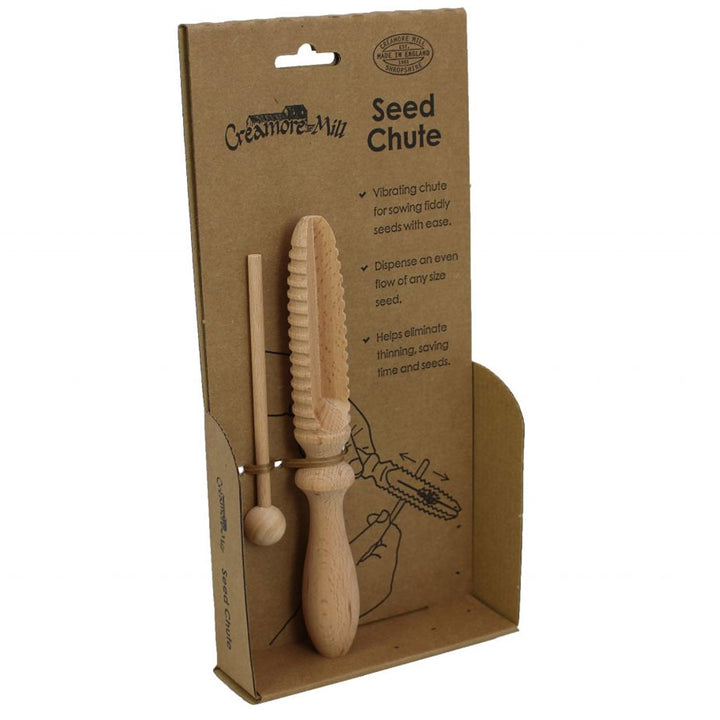 Rubbing the stick on the ribbed chute causes a vibration that allows you to sow seeds with ease. By controlling the flow of seeds you don’t waste as many seeds and the need to thin seedlings later is greatly reduced. The Seed Chute has a beech finish.