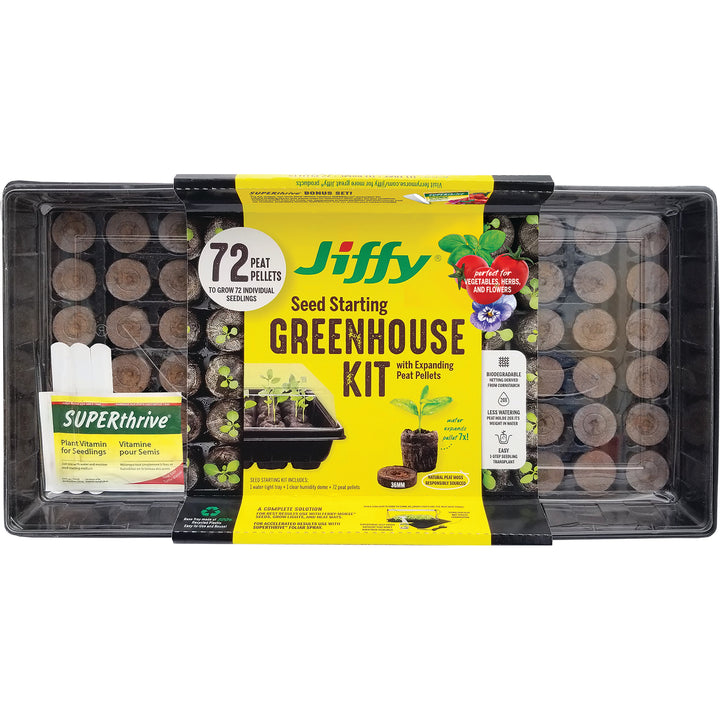 The highest pellet count in a Jiffy greenhouse kit, this 72 count greenhouse is perfect for starting your garden indoors. Kit includes a watertight base tray and clear humidity dome for locking in moisture. As a bonus, get your seedlings started off strong with a sample of SUPERthrive, a kelp-based vitamin for plants. The peat pellets have biodegradable netting derived from cornstarch.