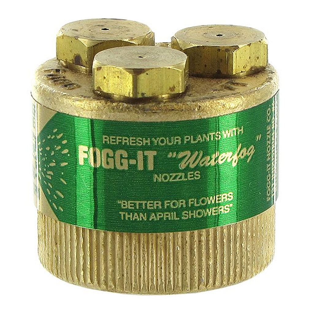 The Fogg-It Nozzle is designed for misting delicate seedlings or for raising humidity around wilting plants. This nozzle has three mist jets which create a conical spray pattern. Available in 4 different discharge rates with a 3/4 hose thread. Made in the U.S.A. from solid brass.