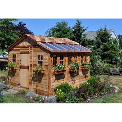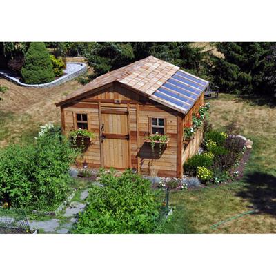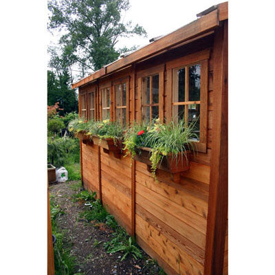 The Sunshed has 10 aluminum-frame, tempered glass windows along the side, and 6 Lexan skylights on the roof, which allow 90% of the light through while blocking harmful UV rays, keeping plants, equipment, and people protected. The 16" wide L-shaped Red Cedar wall workbench is great for getting jobs done, for relaxing and eating at, or, if desired, can even serve as a shelving unit for plants. The Sunshed also comes with 7 flower boxes and a 31" wide Dutch door, which makes for easy and comfortable access while also giving the shed a charming look.