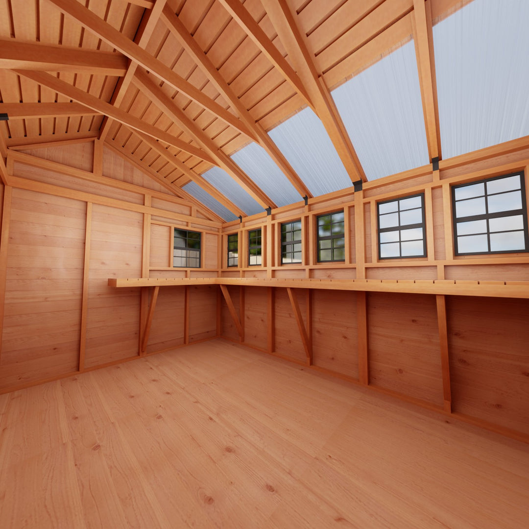 The Sunshed has 8 aluminum-frame, tempered glass windows along the side, and 6 polycarbonate panels on the roof. The Polygal polycarbonate covering is translucent, fluted and filters light, assuring that plants get only the best, most beneficial light. With an R-value of 1.53, it meets universal greenhouse standards for heat flow resistance. The 16" wide L-shaped Red Cedar wall workbench is great for getting jobs done, for relaxing and eating at, or, if desired, can even serve as a shelving unit for plants. The Sunshed also comes with 5 flower boxes and a 31" wide Dutch door, which makes for easy and comfortable access.