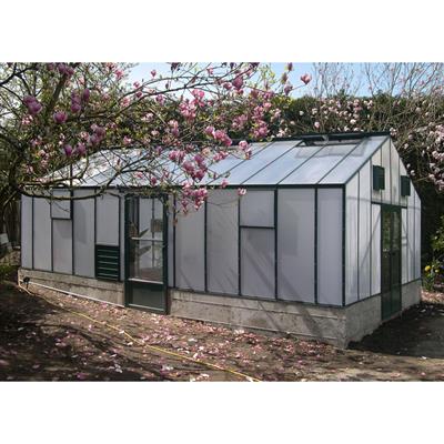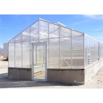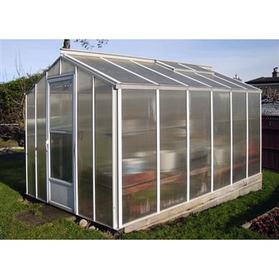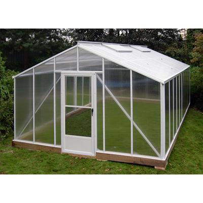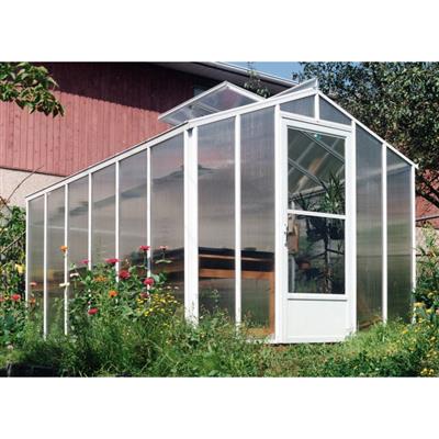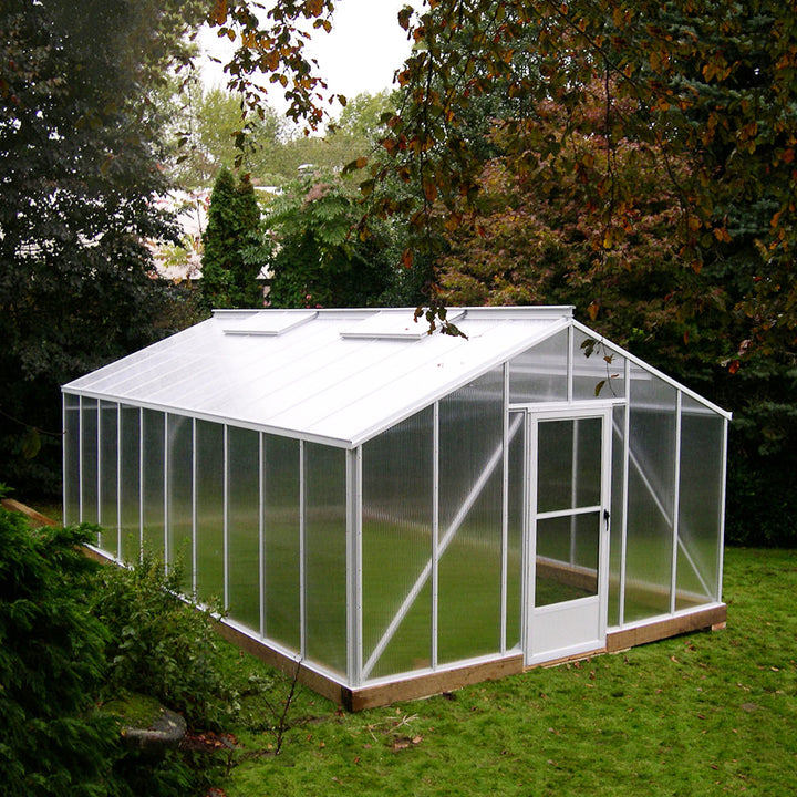 The Traditional Straight Eave Greenhouse is specifically engineered for quality and strength, designed to withstand all weather conditions. Its heavy-duty aluminum structure, finished in white, features a 6mm twin-wall polycarbonate covering for insulation and durability. With extra-high 5' 6" sidewalls, this greenhouse provides ample space for side shelving and optimal growing conditions. The roof bars are designed to support large hanging baskets, while the double-wide individual roof vents ensure proper ventilation. Additionally, the greenhouse includes a premium storm door with an adjustable screened sliding window for added convenience.