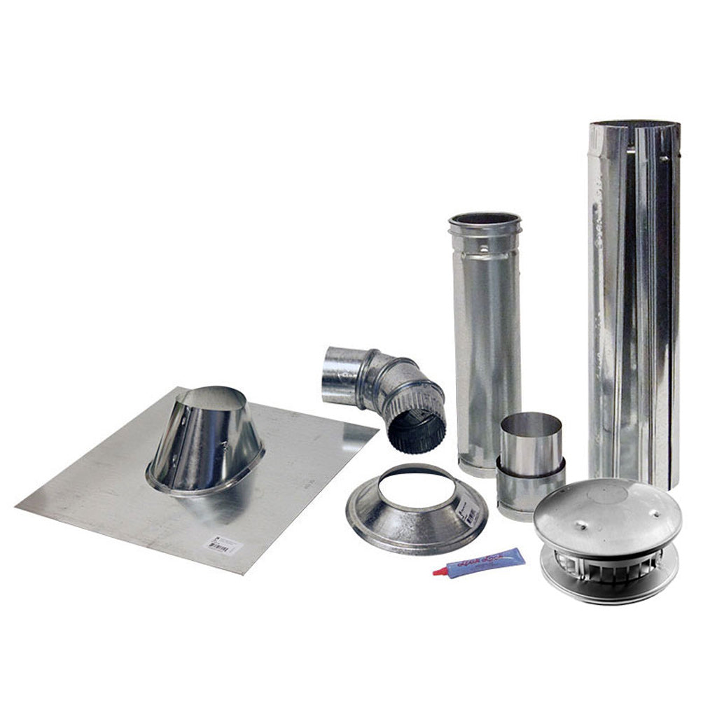 Safely exhaust your gas-fired heater with our easy to use vent kit. Each kit contains a corrosion resistant galvanized steel cap, storm collar, flashing, adjustable elbow, draft hood connector and 4 - 2ft. length of adjustable vent pipe.