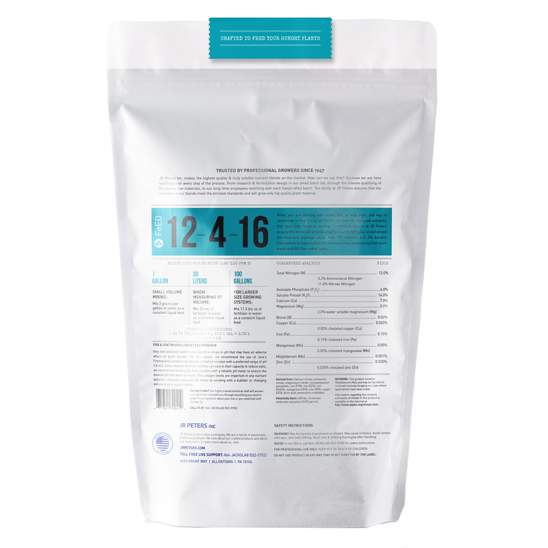 Jack's® Nutrients FeED 12-4-16 RO is a specially crafted one-part nutrient blend that caters to the needs of crops grown in very low alkalinity waters, such as reverse osmosis (RO) water, rainwater, and distilled water. This unique formula is designed for growers who prioritize purity and require a nutrient solution that is compatible with such water sources.