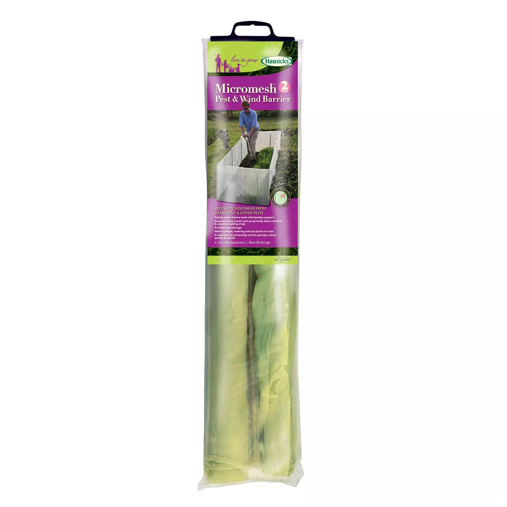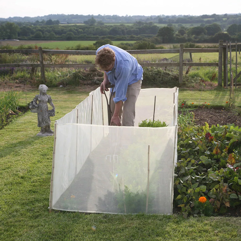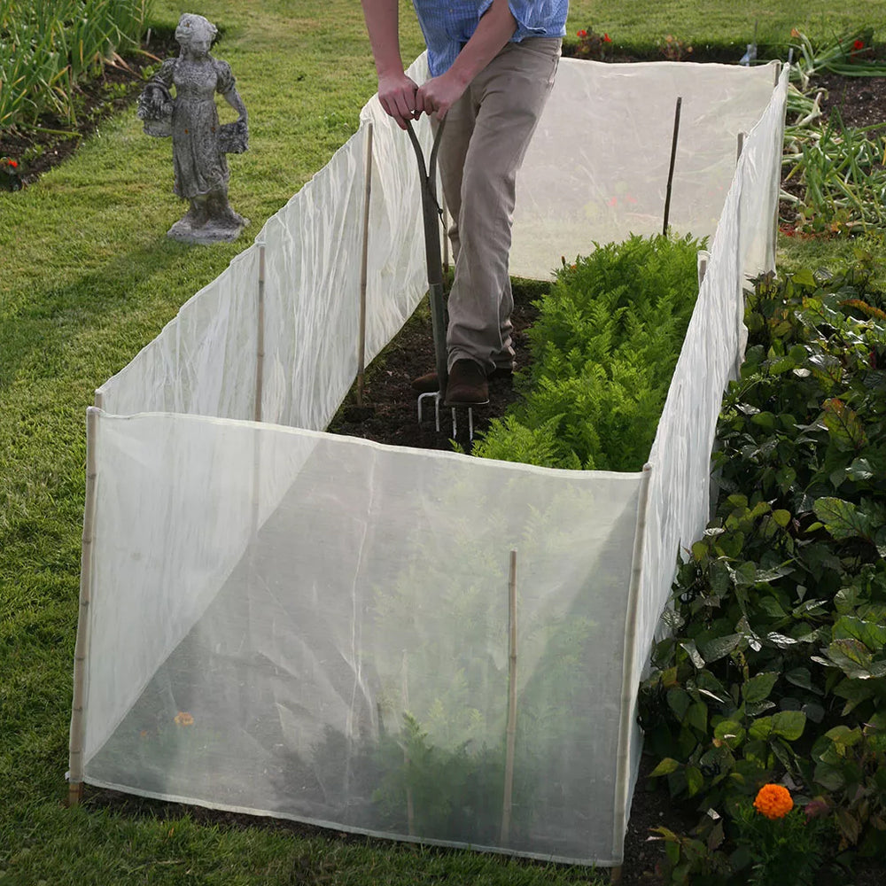 The Pest & Wind Barrier protects your crops from low-flying insects, chickens, rodents, harsh winds, and other potentially damaging factors. Made from 0.6mm green tinted micromesh fabric and featuring bamboo-stake supports, the Pest & Weed Barrier allows sunlight and air through to the crops, while being fine and sturdy enough to stand up to wind and pests.
