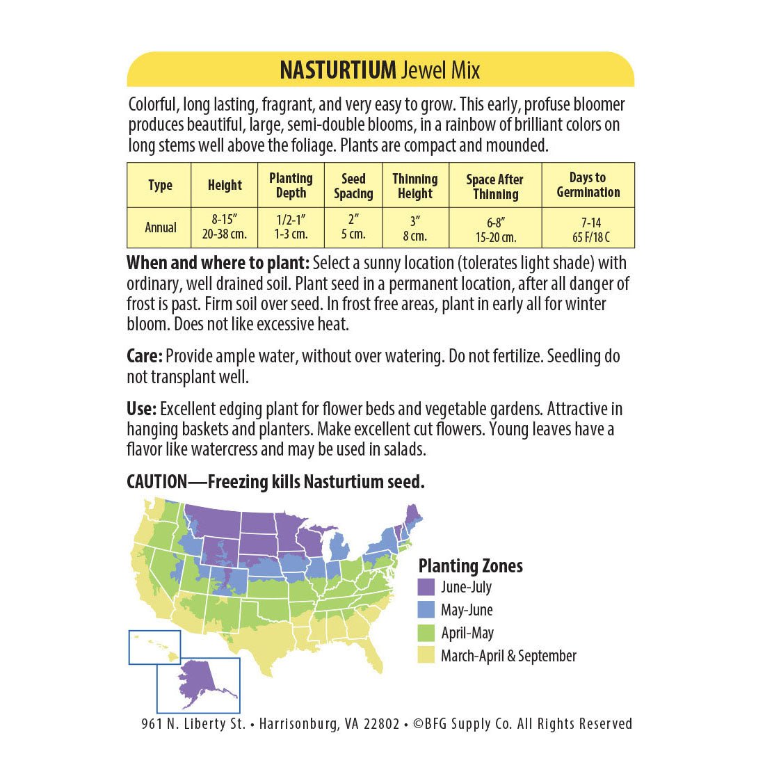 Colorful, long-lasting, fragrant, and very easy-to-grow. This early, profuse bloomer produces beautiful, large, semi-double blooms, in a rainbow of brilliant colors on long stems well above the foliage. Plants are compact and mounded. Excellent edging plant for flower beds and vegetable gardens. Attractive in hanging baskets, planters, and make excellent cut flowers. Young leaves have a flavor like watercress and may be used in salads.