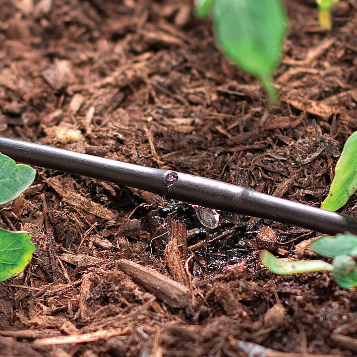 Extremely versatile and flexible, DIG's 1/4" Microline Dripline presents key advantages over other irrigation methods, utilizing low-cost, small-diameter dripline that can be used in any part of the garden for a water-efficient drip irrigation system. The dripline's cylindrical labyrinth drip emitters are inserted into the interior wall of the 1/4" micro tubing every 12" spacing. It can be installed in a wide range of above-ground application layouts, or used under mulch or bark to conserve water or for aesthetic reasons. The dripline is designed to be extended from the drip tubing or micro tubing using a 1/4" barb, or attached into our four- or six-outlet drip manifolds. It can be used in planter boxes, vegetable gardens, window boxes, box gardens, looped around individual plants or trees, in narrow paths of planting areas or where total saturation is desired along the drip line path, while eliminating discoloration of fences, windows and walls due to water staining.