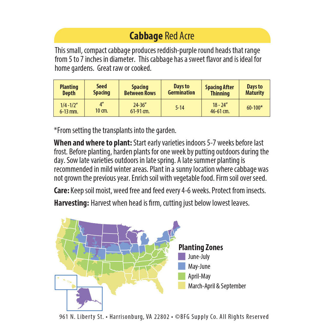 When and Where to Plant: Start early varieties indoors 5-7 weeks before last frost. Before planting, harden plants for one week by putting outdoors during the day. Sow late varieties outdoors in late spring. A late summer planting is recommended in mild winter areas. Plant in a sunny location where cabbage was not grown the previous year. Enrich soil with vegetable food. Firm soil over seed.