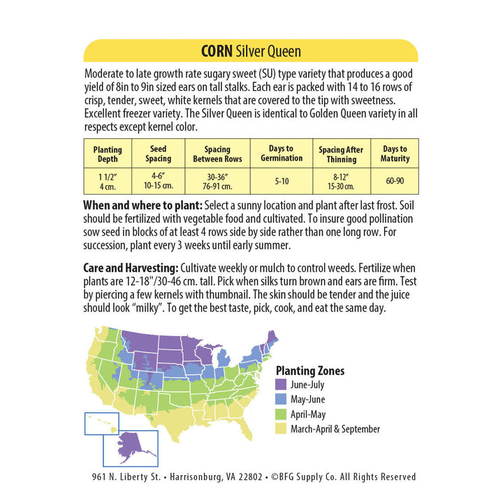 Moderate to late growth rate variety that produces a good yield of regular sweet type ears on tall stalks. Each ear is large and packed with 14 to 16 rows of crisp, tender, sweet, white kernels that are covered to the tip with sweetness. Excellent freezer variety. The Silver Queen is identical to Golden Queen variety in all respects except kernel color.