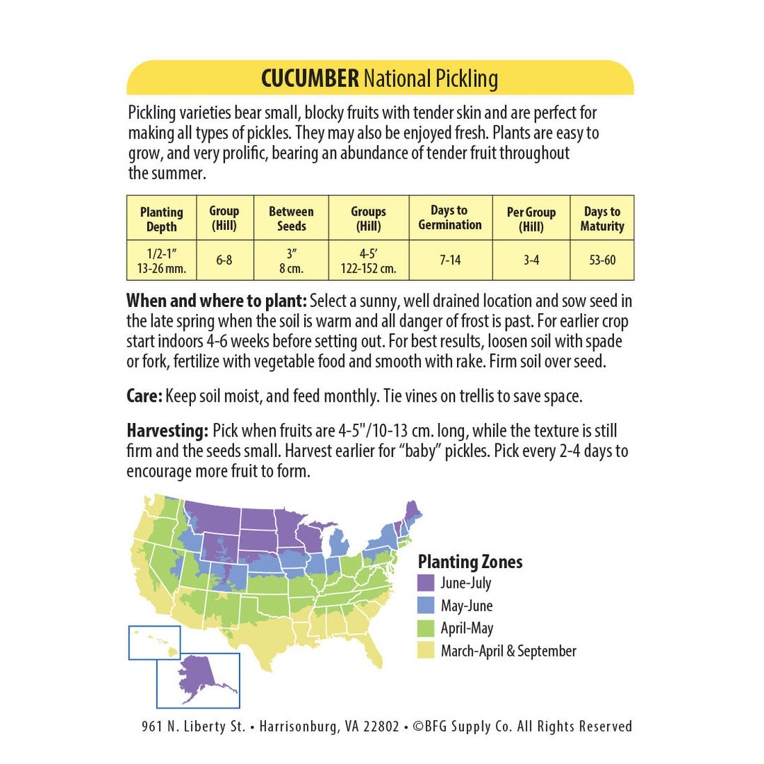 Heavy yielding variety that produces over a long season and was developed by the National Pickle Packers Association. The fruit is tender and delicious at any age, pick at 2-3in as a gherkin, 4in for fresh eating or to mature size to pickle. The crispy, symmetrical, square-ended shape makes them perfect for pickling and the thin-skin allows pickling spices to be receive and capture easily. Also excellent for salads.
