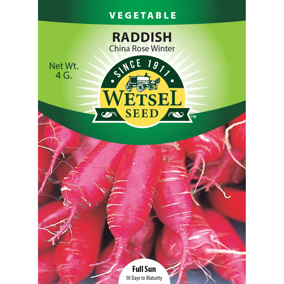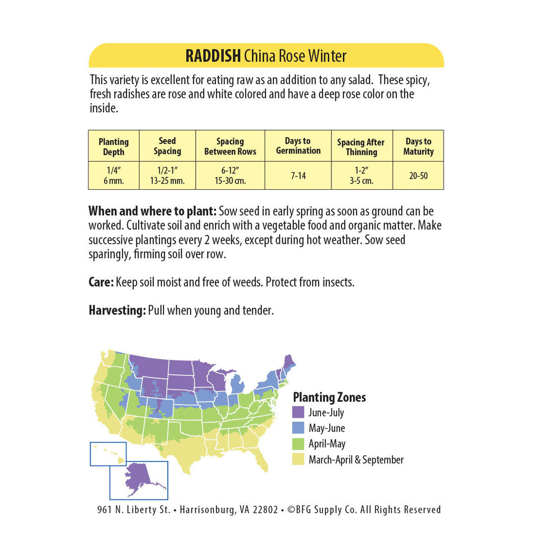 This variety is excellent for eating raw as an addition to any salad. These spicy, fresh radishes are rose and white colored and have a deep rose color on the inside. This unique fall-winter Daikon type radish is very hardy. The root resembles a carrot and can reach up to eight inches long with white, firm and crisp flesh that has a peppery spicy flavor.