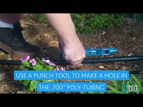 - Option one: Cut a length of two to four feet of 1/4" micro tubing (not to exceed four feet). To the micro tubing end, insert a 1/4" barb. To the other end of the micro tubing, thread the micro sprayer and clip it to a clip stake. Insert the clip stake to the ground, keeping the micro sprayer head at a minimum of six to eight inches above ground for best coverage. Punch a hole into the drip tubing using the small punch or the gun punch, and snap the 1/4" barb at the end of the micro tubing into the drip tubing.
