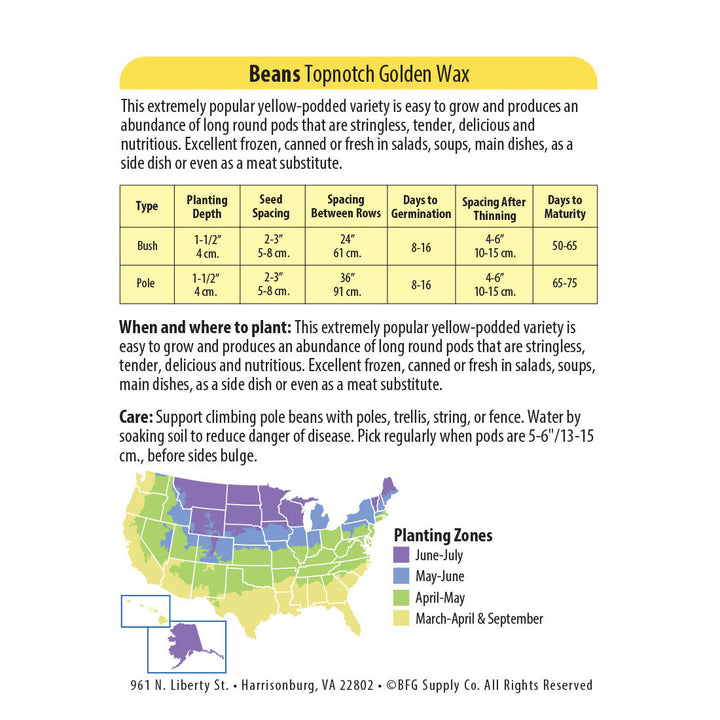 Very productive, upright compact bush variety of waxed bean. Pods are ready for picking as early as 50 days, and continue to appear on the plants until frost. Has a mild, buttery-sweet taste when cooked and taste delicious as dry shell bean also. Great for canning or freezing.