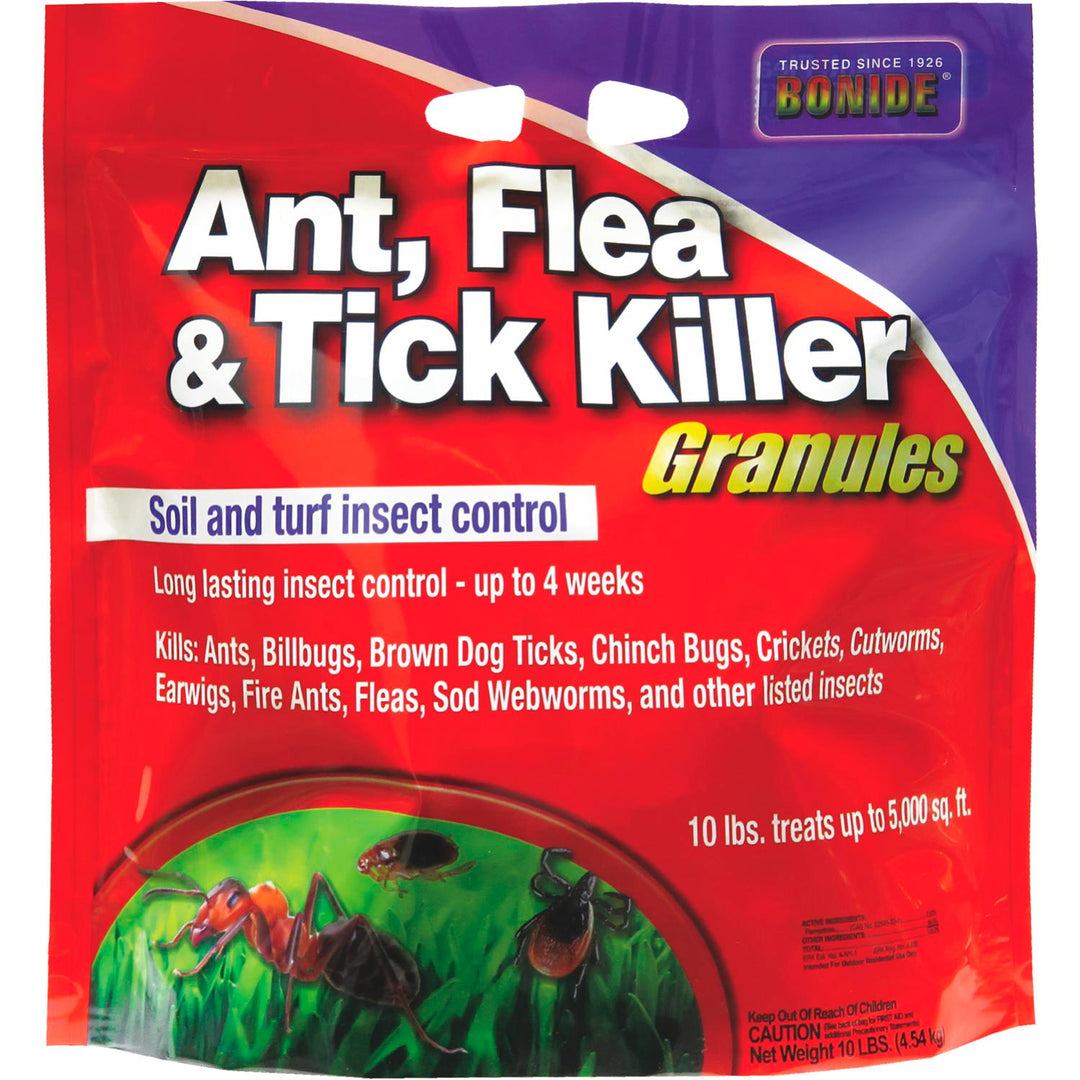 Fast acting, long lasting (4 weeks) insect control for lawns and home foundations. Great for ants, fire ants, fleas, ticks, crickets, earwigs, spiders, sowbugs, silverfish, clover mites, chinch bugs, armyworms, sod webworm, leaf hoppers, millipedes and certain grubs. 10 lbs. treats 5,000 sq. ft. Granules should either be distributed as a barrier around the house foundation or spread throughout the lawn with a spreader. No need to mix or spray.