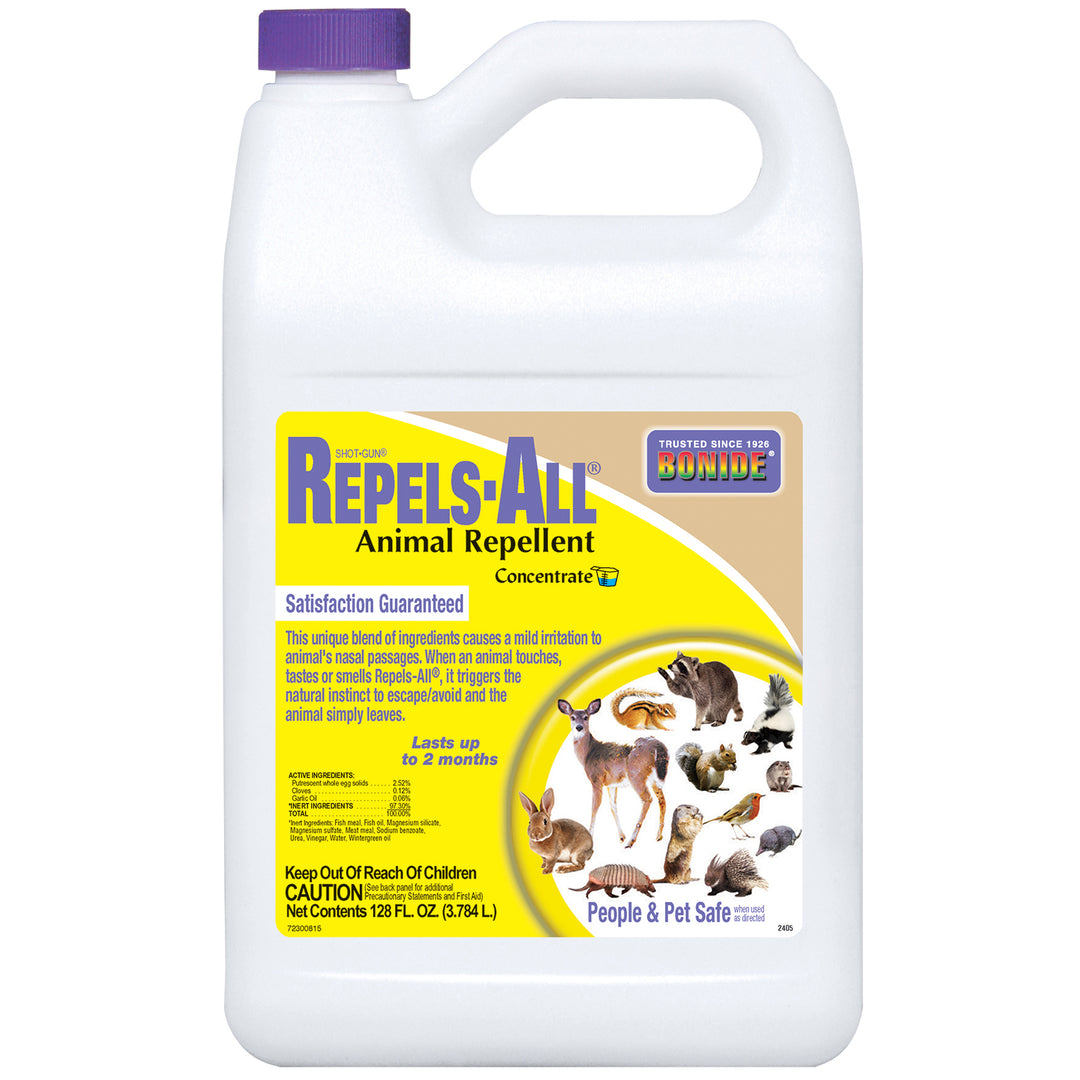 Repels-All Liquid acts as a natural deterrent to squirrels, deer, rabbits, chipmunks, mice, skunks, rats, beavers, raccoons, porcupines, birds, groundhogs and even more pests. Repels-All uses natural ingredients to deter animals without causing them harm. Repels in three ways, by sense of touch, taste, and smell.