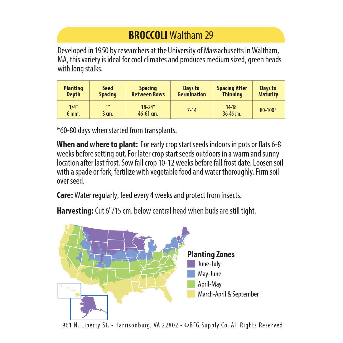 Developed in 1950 by researchers at the University of Massachusetts in Waltham, MA, this variety is ideal for cool climates and produces medium sized, green heads with long stalks.