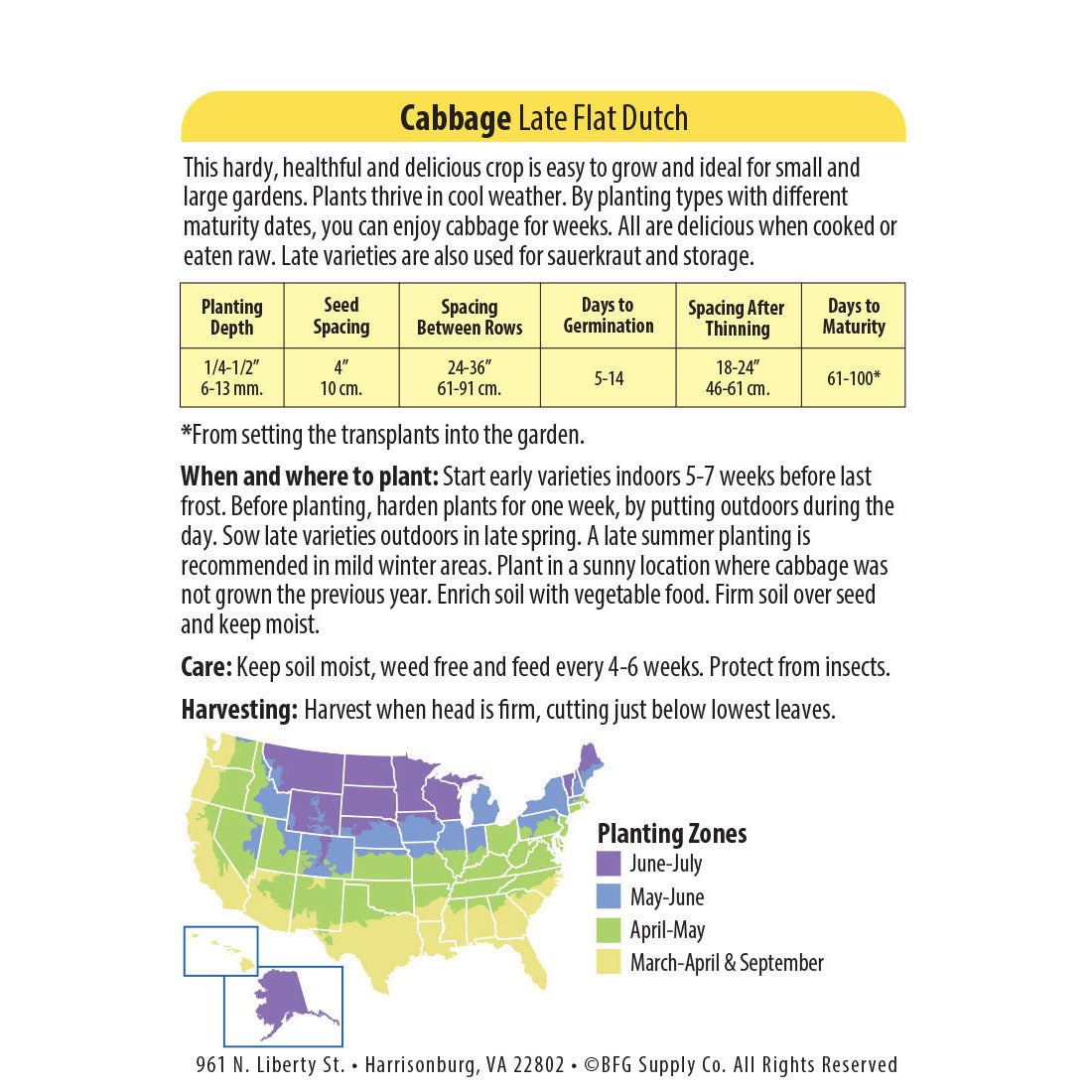 When and Where to Plant: Start early varieties indoors 5-7 weeks before last frost. Before planting, harden plants for one week, by putting outdoors during the day. Sow late varieties outdoors in late spring. A late summer planting is recommended in mild winter areas. Plant in a sunny location where cabbage was not grown the previous year. Enrich soil with vegetable food. Firm soil over seed and keep moist.