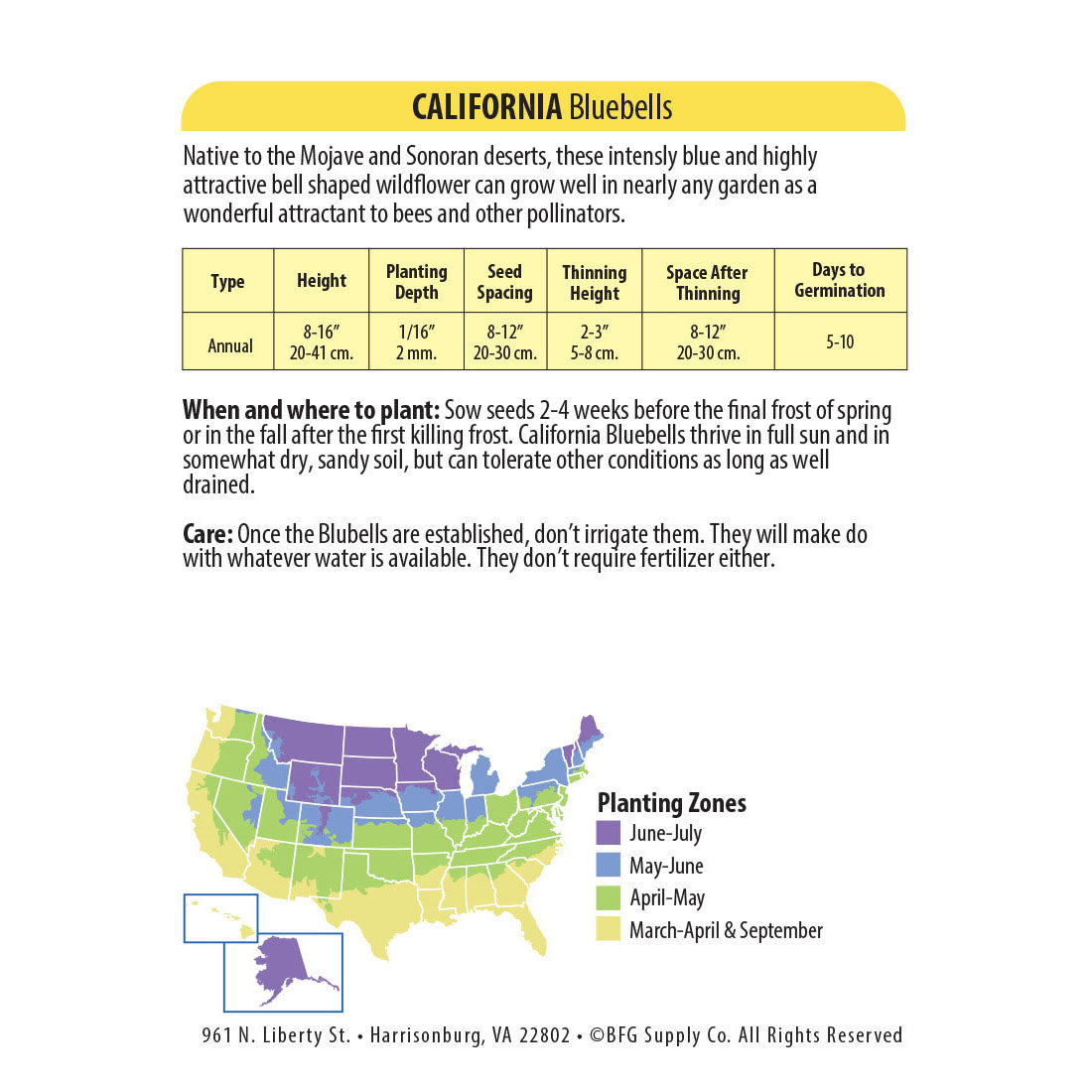 When and Where to Plant: Sow seeds 2-4 weeks before the final frost of Spring or in the Fall after the first killing frost. California Bluebells thrive in full sun and in somewhat dry, sandy soil, but can tolerate other conditions as long as well-drained.