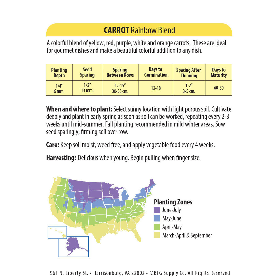 When and Where to Plant: Rainbow Blend Carrot seeds can be planted directly outdoors in early spring or late summer. Choose a location with well-drained soil that receives full sun. Carrots can tolerate some light shade, but full sun is ideal for better root development. Carrots don't require heavy fertilization. However, incorporating compost or a balanced fertilizer into the soil before planting can provide the necessary nutrients.