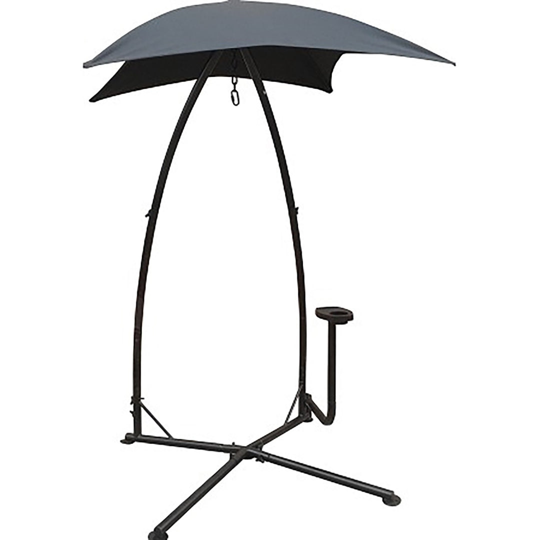 The Backyard Expressions X-Base Hanging Chair Frame is a perfect match for almost any hammock chair, wicker hanging chair, or other kinds of suspended seating products. The X-shaped base increases the stability of the stand and the 5/8 in. ground stakes easily and safely secure the stand in your yard. The built-in umbrella-style shade is sleek and protective. Includes built-in cup holder.