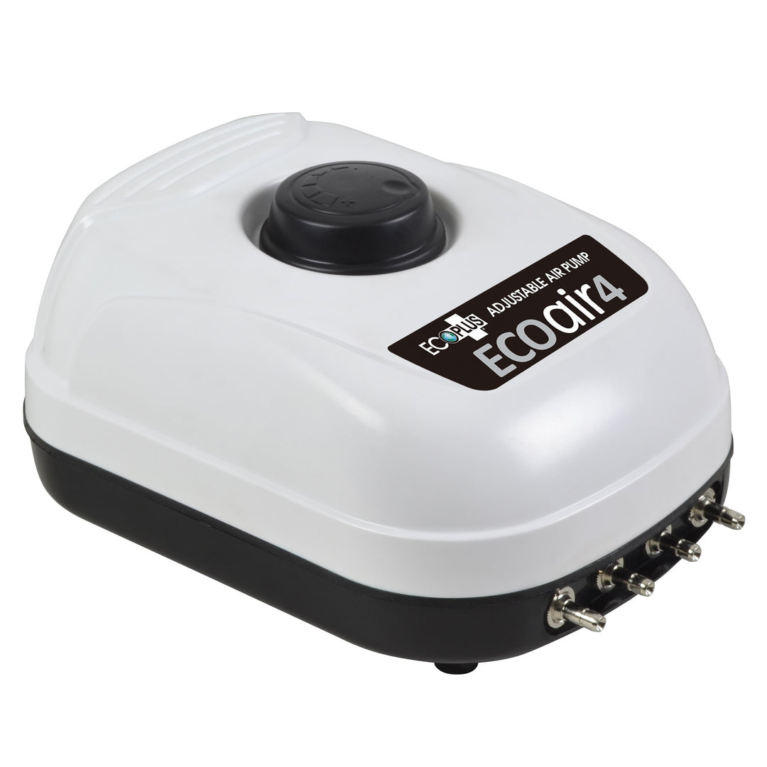 - Eco Air 4: Flow Rate: 253 GPH, Pressure: 1.5 PSI, Power: 6.5 Watt, Outlets: 4; Dimensions: 8.6 in. L x 6 in. W x 4.3 in.