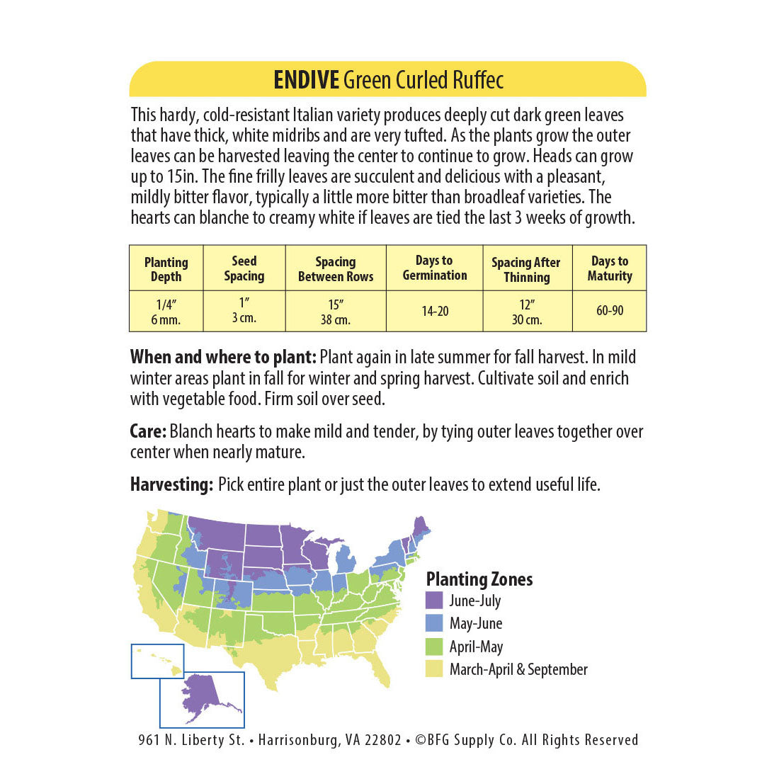 Hardy and cold resistant Italian variety that produces deeply cut dark green leaves that have thick, white midribs and are very tufted. As the plants grow the outer leaves can be harvested leaving the center to continue to grow. The fine frilly leaves are succulent and delicious with a pleasant, mildly bitter flavor, typically a little more bitter than broadleaf varieties. The hearts can blanche to creamy white if leaves are tied the last 3 weeks of growth. Adds a tasty and unusual punch to salads.