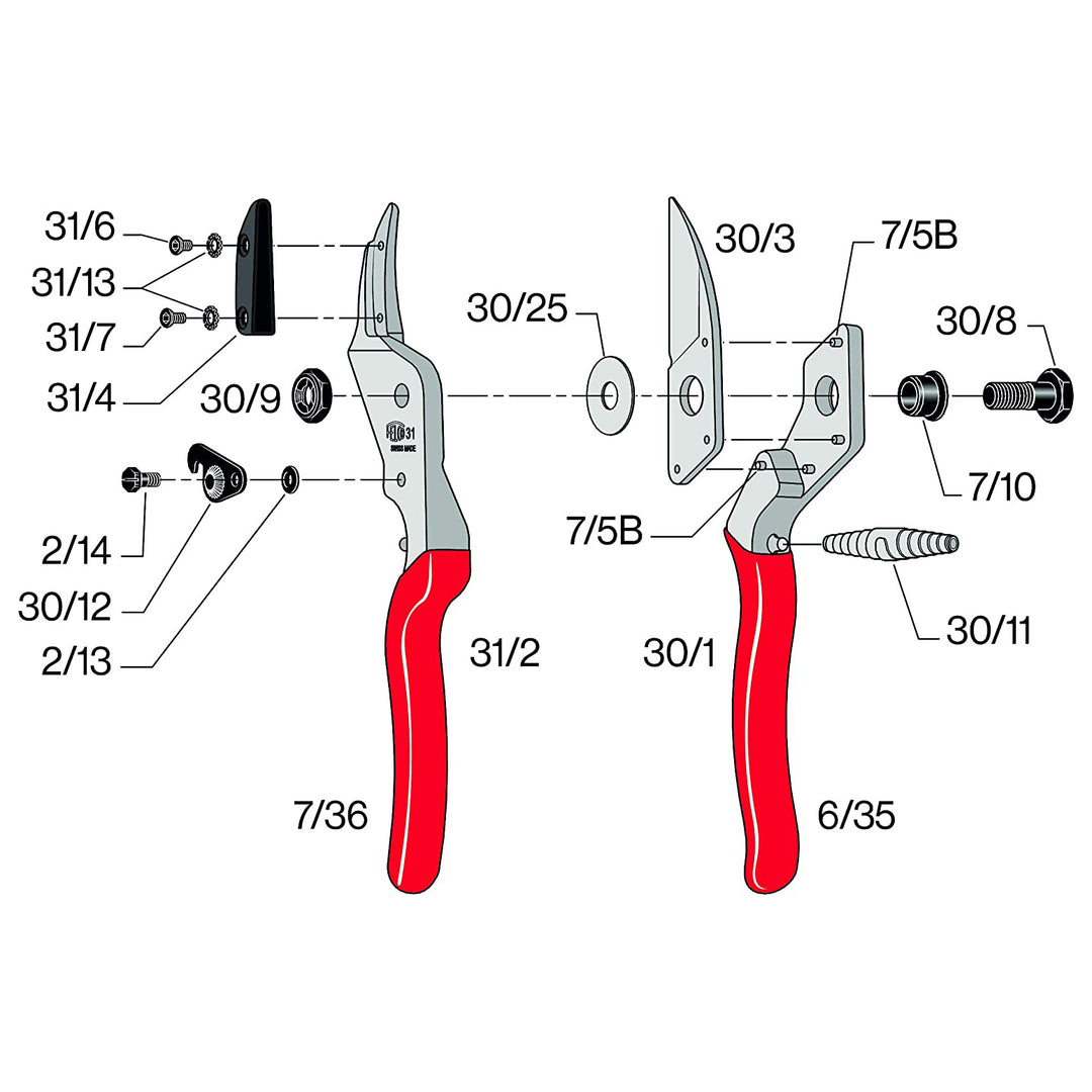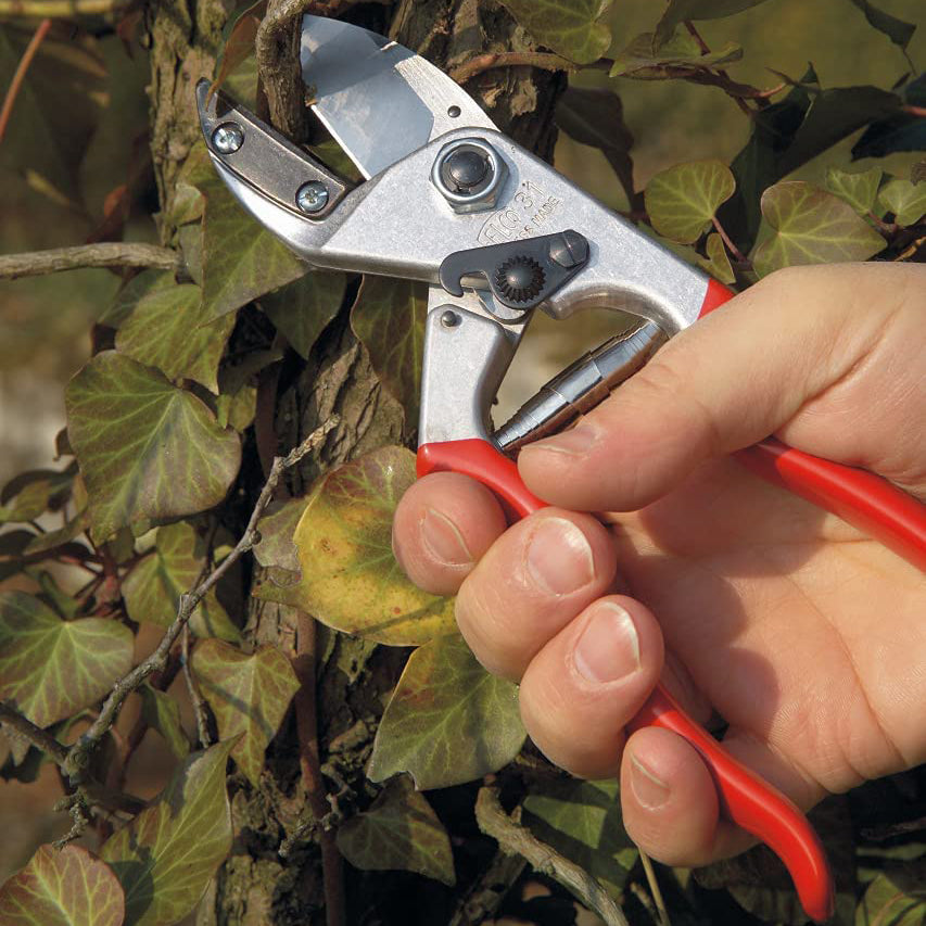 The one-hand "CLASSIC" pruning shears satisfy all requirements. Regardless of pruning technique, work duration or hand shape, there is a classic model to suit every customer. Good performance - Anvil model. Reliable: comfortable, light, sturdy handles made of forged aluminium with a lifetime guarantee. Blade made of high-quality hardened steel and screw-mounted adjustable brass anvil. Clean, precise cut. All parts can be replaced. Efficient: easy cutting adjustment. Ergonomic: hand protection is provided by the ideal shape of the handles. Non-slip coating. Cuts up to 1 inch diameter. Forged aluminium handles guaranteed for life. Lightweight, strong and sturdy thanks to special aluminium alloys and advanced precision forging methods perfectly mastered by Felco. Composite material handles. Super-strong fibreglass reinforced composite material. Ergonomic tool. Inclined cutting head to reduce the risk of muscular-skeletal injuries and to MAX user comfort. The best raw materials. Felco systematically selects technologically-advanced materials: precision-forged aluminium, carbon fibre, composites and high-grade extruded aluminium alloys which all contribute to great structural strength and minimal tool weight. Highly efficient cutting heads. Felco's choice of premium quality steel and its mastery of heat treatments guarantees the remarkable performance, reliability and strength of its cutting heads. Spare parts. Felco offers a complete range of spare parts to ensure the longevity of its tools. When a part becomes worn, damaged or is lost, there is no need to buy a complete new tool: replacing the relevant part is all that is required.