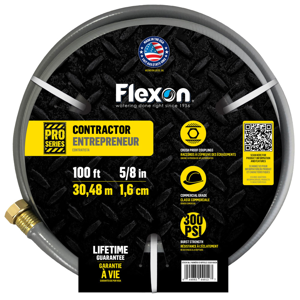 This rugged garden hose boasts 5-ply construction that is made from rubber and vinyl for use in any season. It features a patented Guard-N-Grip connector that easily attaches to a water source with no leaks and crush-resistant couplings that stand up to rugged use.
