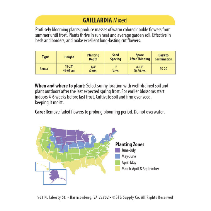 Also known as Blanket Flowers. Plant has a clump growth habit with hairy, narrow, gray-green leaves. The daisy-like flowers have petals banded in combinations shades of red or orange with yellow adding sizzle to the garden and attracting nectar-seeking butterflies. Excellent for beds, borders and cut flowers.