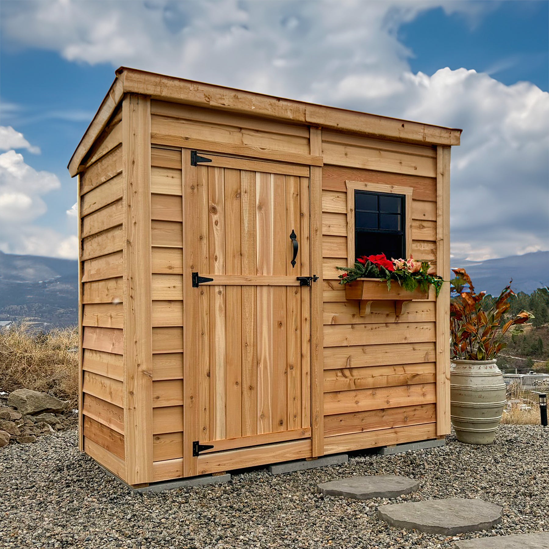 Made in Canada with Sustainably Sourced American and Canadian Western Red Cedar. Made from Sustainably sourced Western Red Cedar in Penticton BC, the 8 ft. x 4 ft. Garden Saver Shed with Single Door features a high front roof that slopes to the rear to divert water away from the shed and its contents inside.