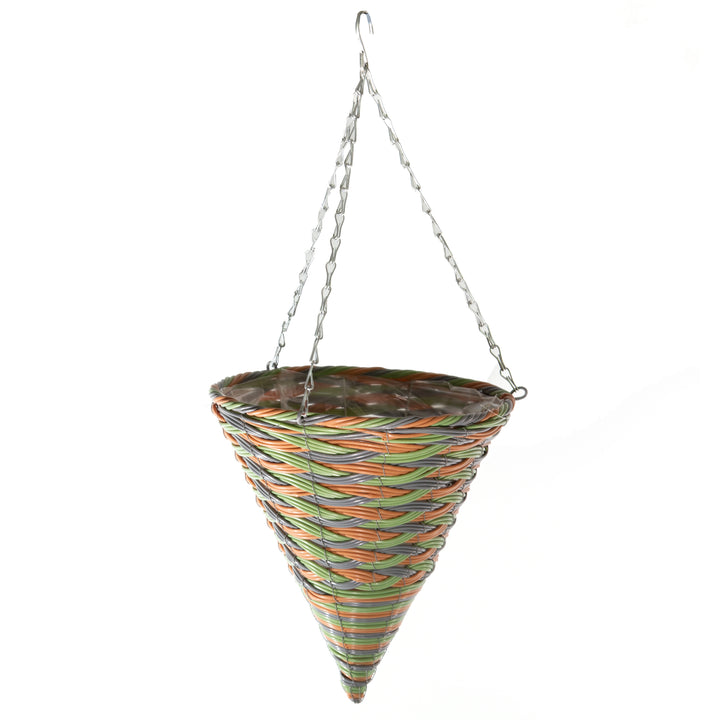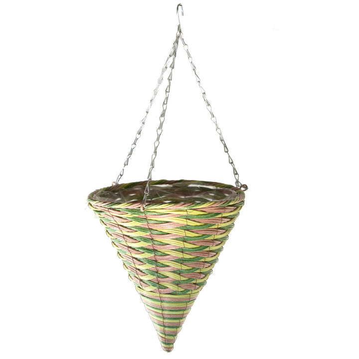 Spruce up your porch, patio or garden with Gardener Select® Cone Rattan Hanging Baskets. These colorful rattan wicker cone baskets are made of plastic, so they are perfect for both indoor and outdoor use. Hang anywhere with the 3-piece chain and hook. Interior plastic liner for added water retention.