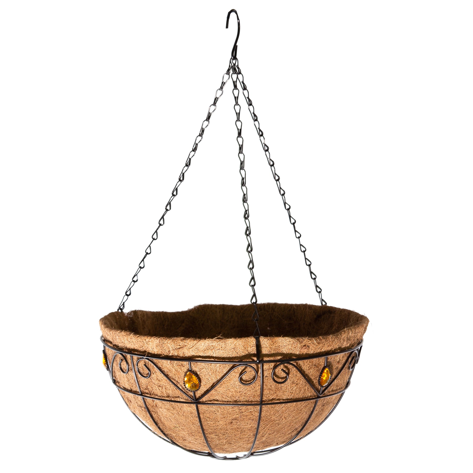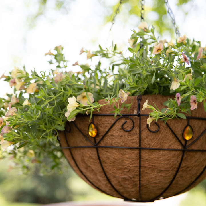 The Gardener Select® 14-inch Jewel Collection Hanging Basket boasts a durable wire scroll metal frame coated in sleek black powder for enhanced longevity. Its charming yellow jewel accents add a touch of elegance. Comes complete with a convenient chain hanger and replaceable coco liner.