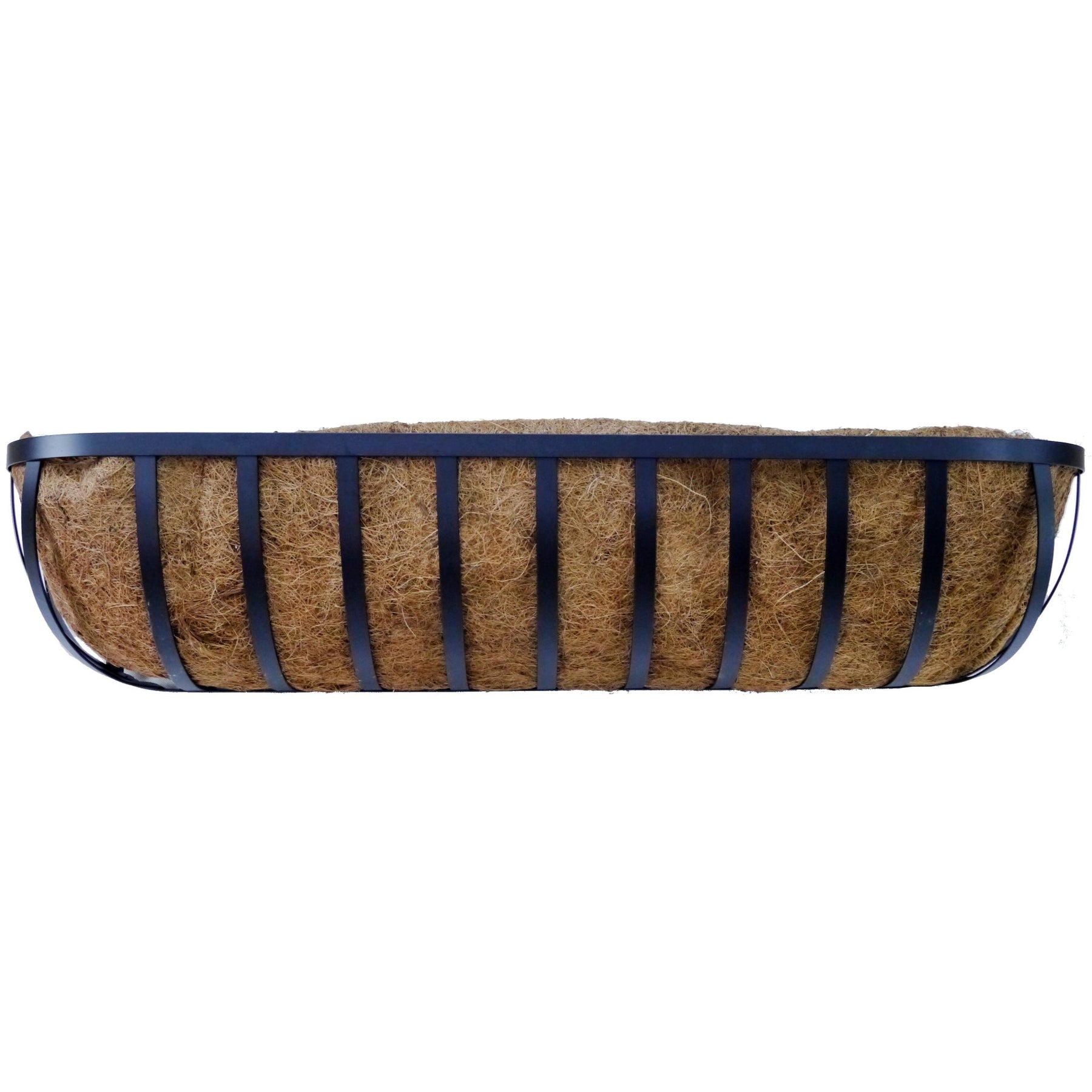 The planter features a sturdy metal banding with a black powder-coated finish, ensuring durability and resistance to outdoor elements. This metal banding serves as a frame for the included coco liner, providing a secure and attractive base for your plants. Two mounting brackets are included, allowing for easy installation and secure attachment to your desired location. Whether you choose to display it as a window box or attach it to your deck railing, you can enjoy the flexibility and convenience of this planter.