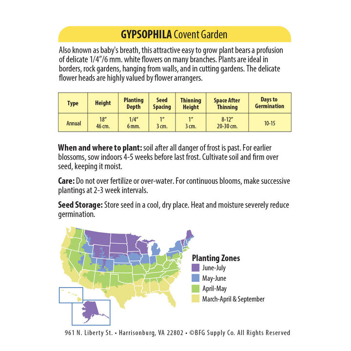 Commonly known as Baby's Breath. Plants are narrow and sickle-shaped, linear to triangular with stems that separate into many branches. Each stem has hundreds of tiny white flowers on wire-thin branches, giving an airy, soft impression. Ideal for borders, cut flowers and makes a great dried flower.
