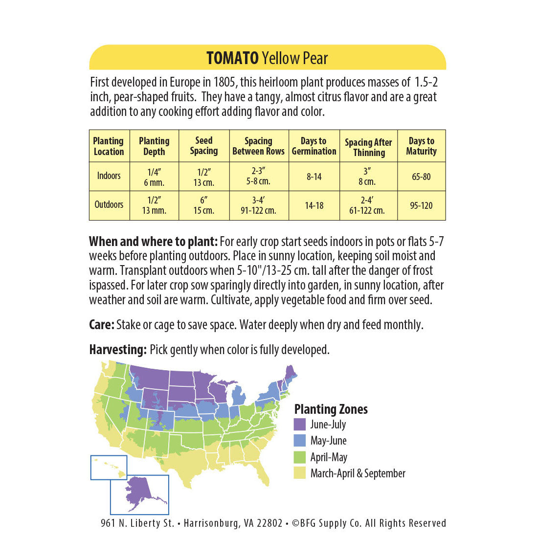 Rich in Vitamins A and C. Also supplies some B Vitamins, Calcium, Iron, and Potassium. Grows well in containers and requires little space or effort to produce a big crop. Stake or cage to save space. Water deeply when dry and feed monthly. Pick gently when color is fully developed.