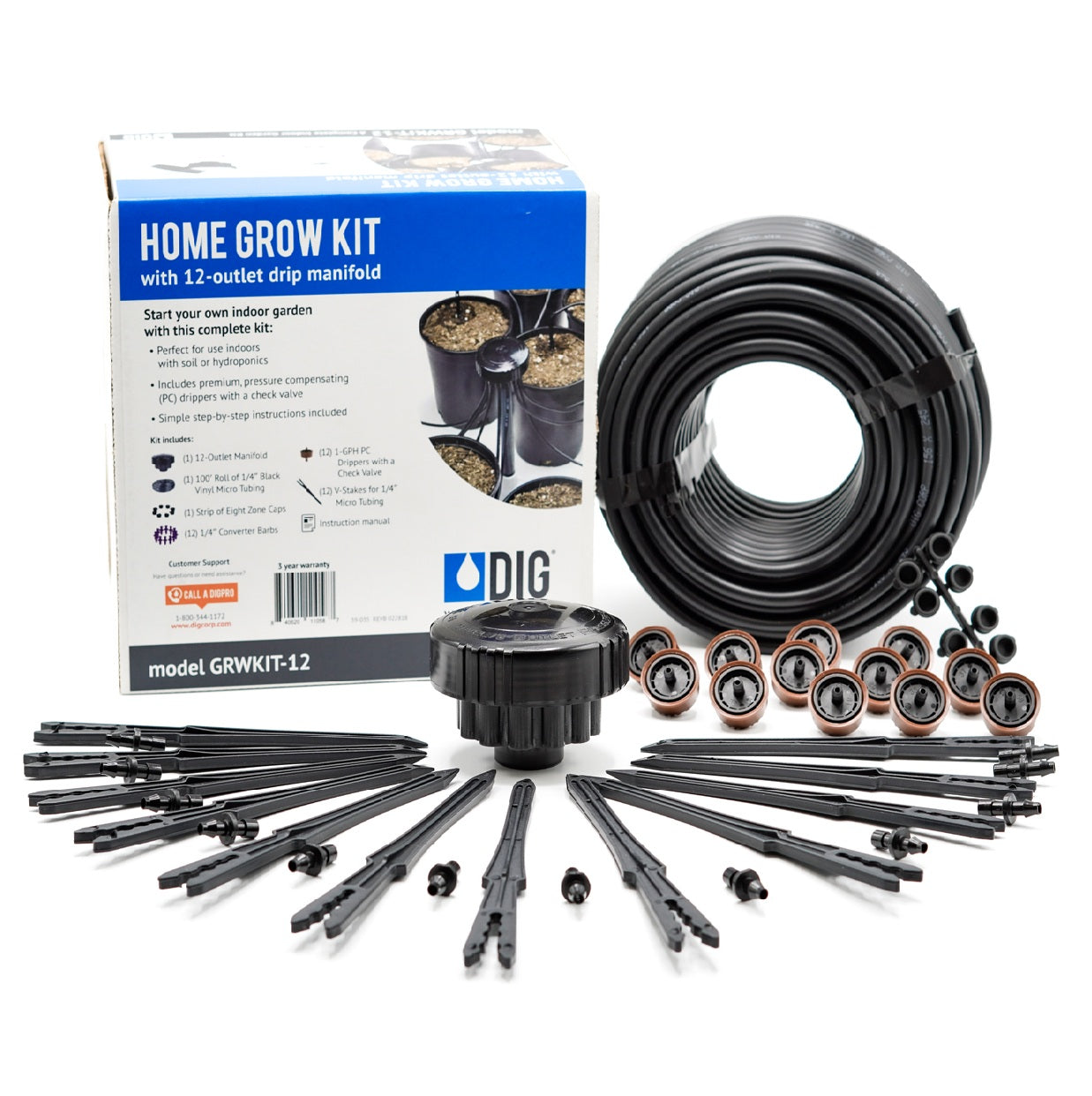The 12 Home Grow Drip Kit can be used to grow up to 12 potted plants with any medium in small to large spaces, indoor or outdoor. The kit includes a 12-outlet manifold, micro tubing to extend the emitters to the plants, and 12, 1-GPH PC drip emitters with a check valve. When the water is shut off, the drip emitters stop dripping as pressure drops below 2.2 PSI, leading to less water waste and nutrient runoff. This concept is the most simple and advanced design for starting a drip system retrofitting a 1/2" sprinkler riser. DIG's Home Grow Kit may be used as an individual kit to cover up to 12 pots or incorporated into a system with a substantially greater number of pots to grow herbs, strawberries, cannabis, tomatoes and more.