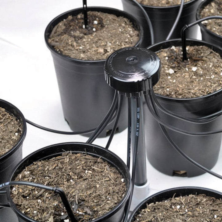 The 12-Outlet Drip Kit may be used as an individual kit to cover up to 12 pots or incorporated into a system with a substantially greater number of pots to grow potted plants, including herbs, strawberries, cannabis, tomatoes and others.