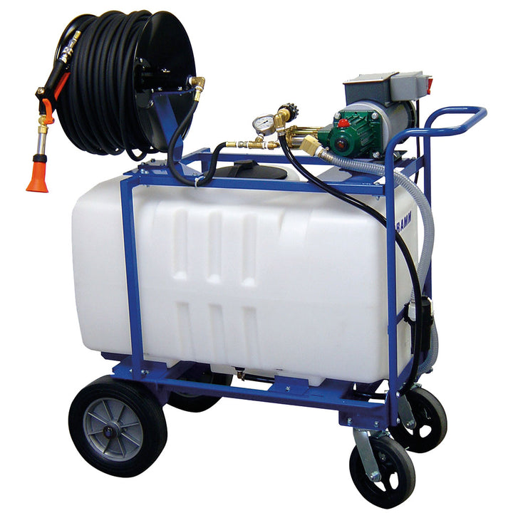 The standard gun offers a choice of patterns with an output of 1.3 gallons per minute. The Hydra comes standard with a 50 gallon tank on a maneuverable cart with rear casters for easy turning when full. Can be purchased with 150, 200, or 250 feet of hose on a variable drag reel.