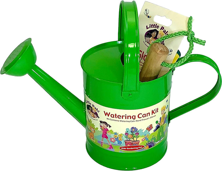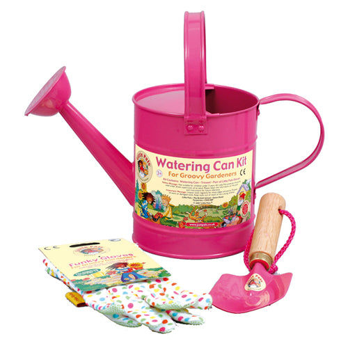 The set includes green or pink metal watering can, coordinating gloves and hand trowel – sized perfectly for little hands. The watering can cleverly doubles as a storage compartment for the tools and gloves, making clean-up a breeze.