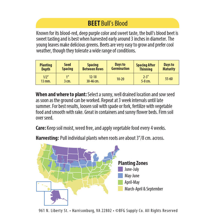Known for its blood-red, deep purple color and sweet taste, the bull's blood beet is sweet tasting and is best when harvested early around 3 inches in diameter. The young leaves make delicious greens. Beets are very easy-to-grow and prefer cool weather, though they tolerate a wide range of conditions. Pick Early for Microgreens!