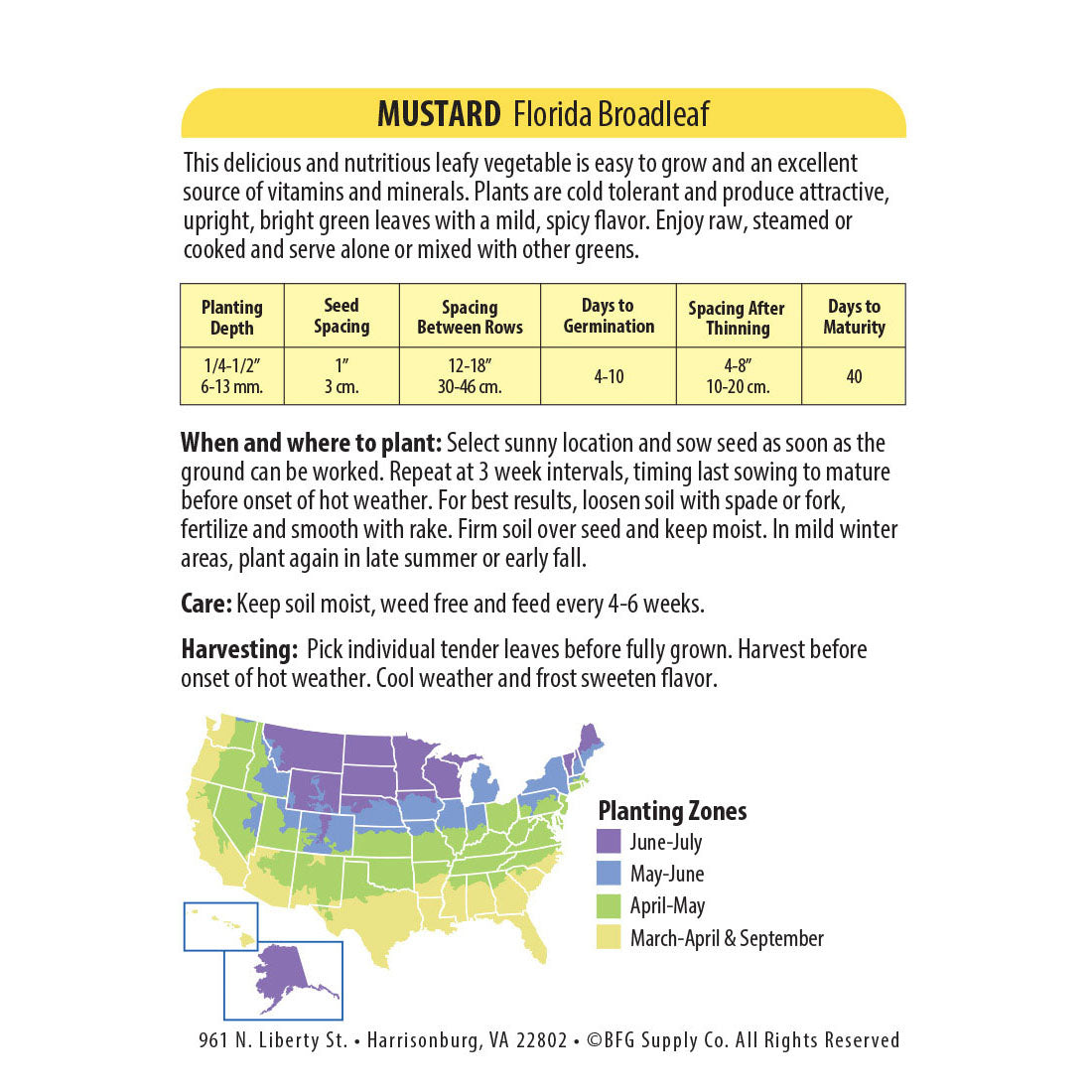 Harvesting: Pick individual tender leaves before fully grown. Harvest before onset of hot weather. Cool weather and frost sweeten flavor.
